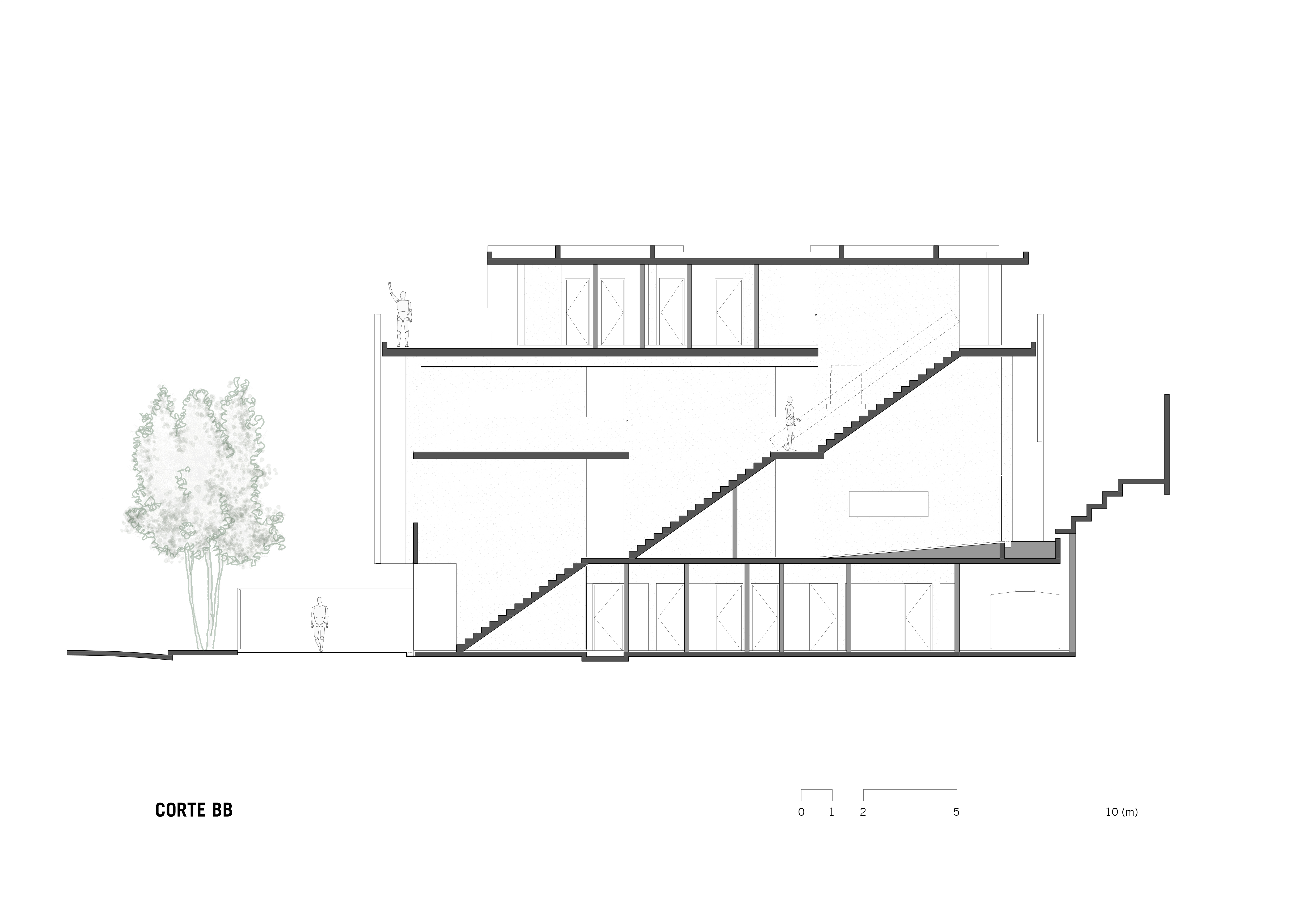 O projeto consiste numa quadra poliesportiva para a associação, pensada como um anexo ao centro comunitário pré-existente, um projeto também nosso de 2004. Com isso, o novo equipamento se vale dos mesmos níveis dos pavimentos do edifício anterior, permitindo uma integração total entre os dois prédios e programas em todos os andares.